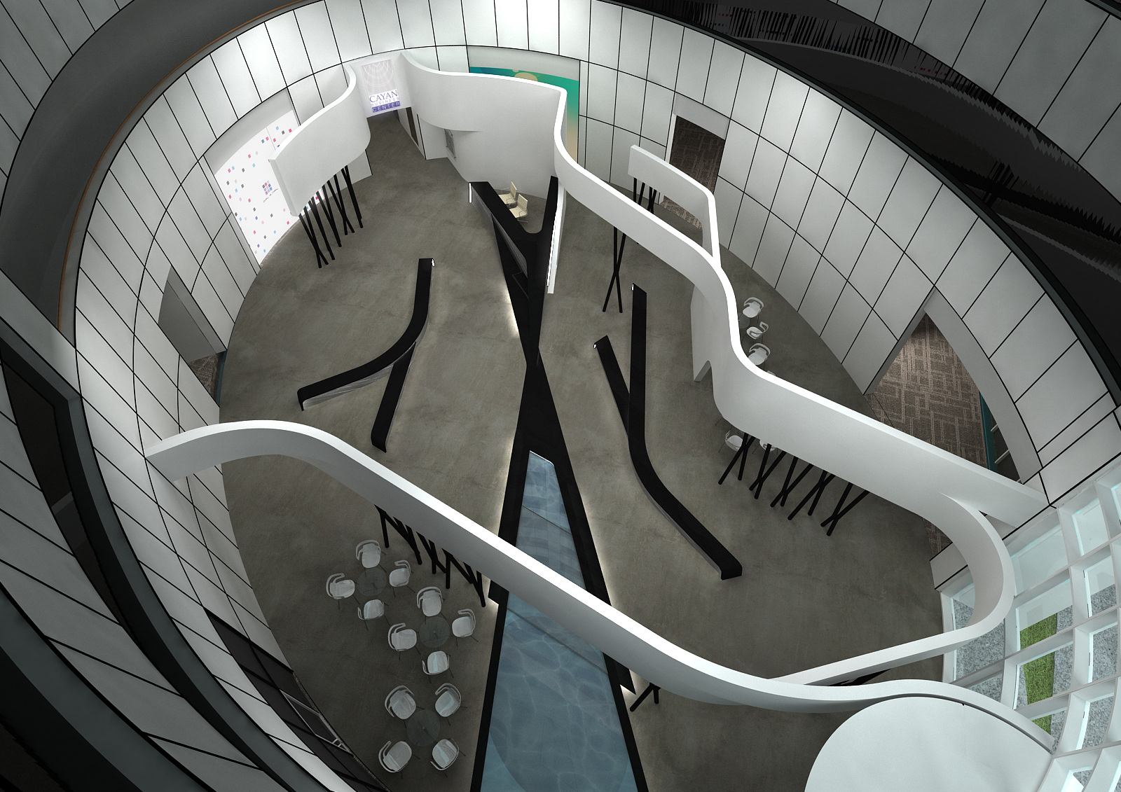 The concept of the Lobby was inspired by two main components. First, the architectural wavy shape of the building itself, following its imposing ellipse shape, to the white layers that create each floor, strip by strip.